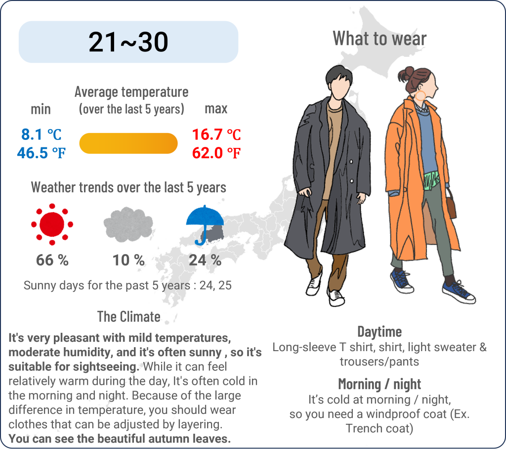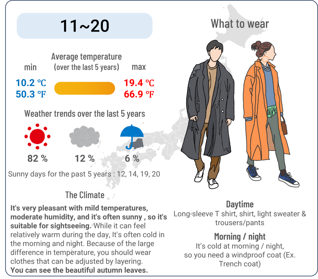 Hiroshima November 04.11.202409.12.2024 November 1~10 Click here to see the weather in November for the past 5 years. November 11~20 Click here to see the weather in November for the past 5 years. November 21~30 Click here to see the weather in November for the past 5 years.