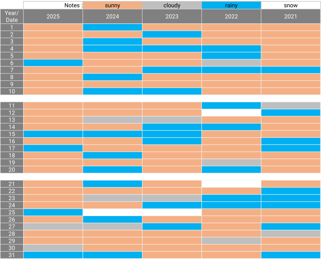 The weather: Kyoto January 07.08.202409.02.2025 The weather in January for the past 5 years Sunny days for the past 5 years: 9