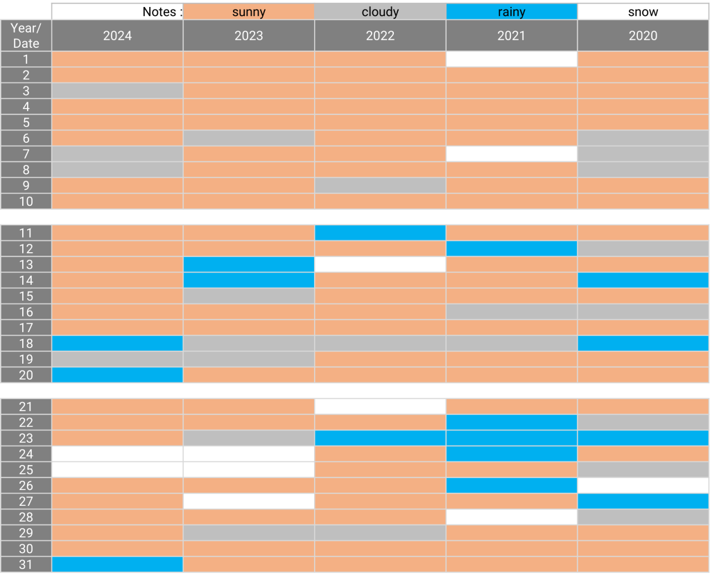 The weather: Hiroshima January 04.11.2024 The weather in January for the past 5 years Sunny days for the past 5 years: 2, 4, 5, 10, 17, 30