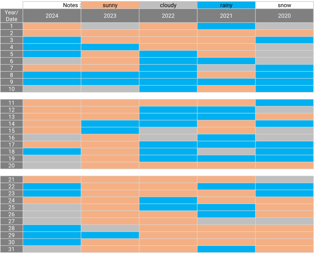 The weather: Kawaguchiko, Yamanashi October 26.12.2024 The weather in October for the past 5 years Sunny days for the past 5 years: 2