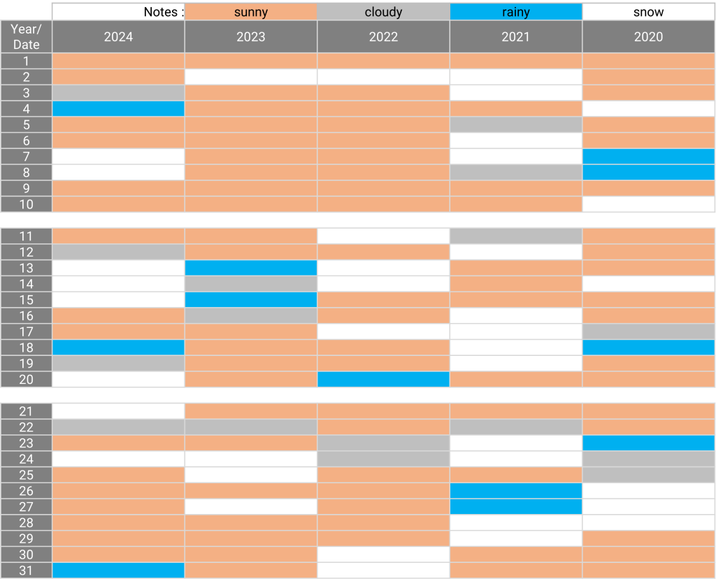 The weather: Matsumoto, Nagano January 27.12.2024 The weather in January for the past 5 years Sunny days for the past 5 years: 1, 9