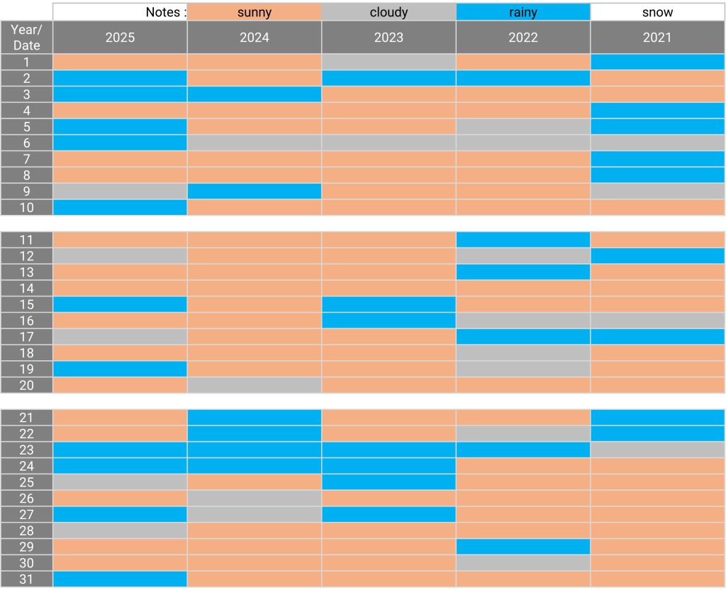 The weather: Okinawa January 27.12.202414.02.2025 The weather in January for the past 5 years Sunny days for the past 5 years: 14