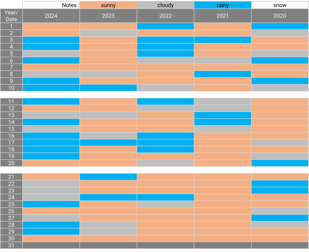 The weather: Okinawa September 27.12.2024 The weather in September for the past 5 years Sunny days for the past 5 years: 30
