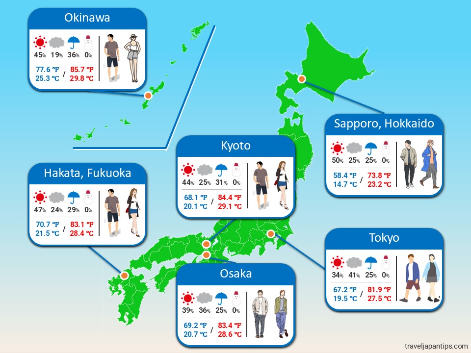 - Tokyo, Osaka, and Fukuoka also experience high humidity, making the weather feel hotter. Wearing breathable clothing (linen, cotton, or moisture-wicking fabrics) helps keep you comfortable.
