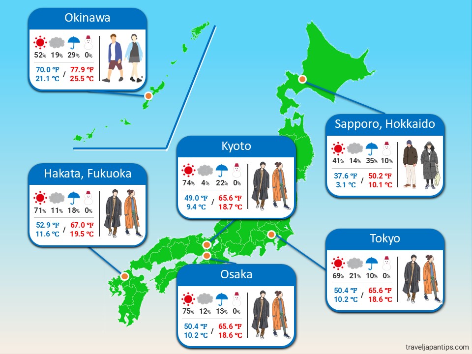 - Significant temperature differences by region – Hokkaido & Tohoku require heavy coats, Tokyo, Osaka, and Kyoto need layers and jackets, and Okinawa stays warm enough for short sleeves during the day.